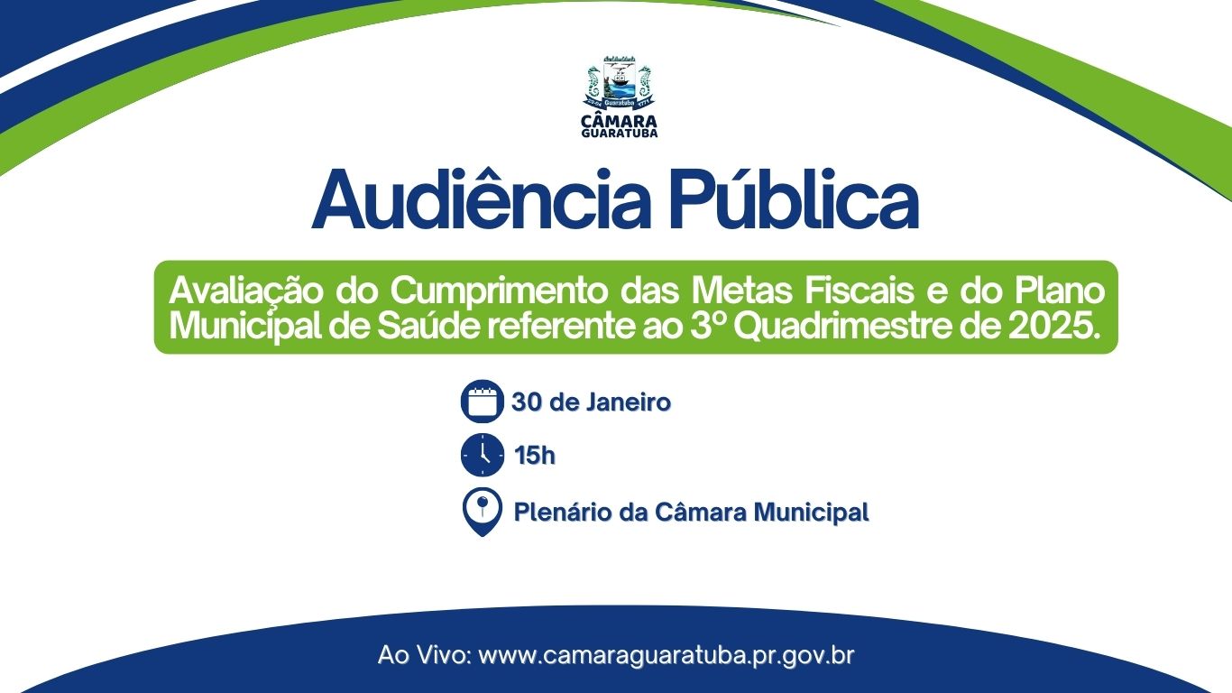 A Câmara Municipal convida para Audiência Pública de Avaliação do Cumprimento das Metas Fiscais e do Plano Municipal de Saúde referente ao 3º quadrimestre de 2025.
