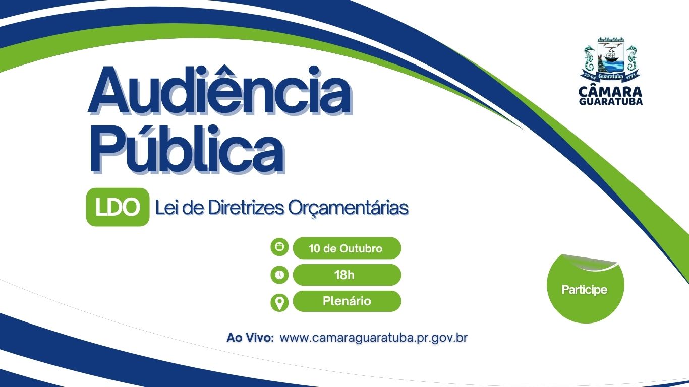 A audiência está marcada para o dia 10 de outubro às 18h, no plenário da Câmara Municipal de Guaratuba, podendo ser acompanhada também pelo nosso site: www.camaraguaratuba.pr.gov.br, e pelas nossas redes sociais: